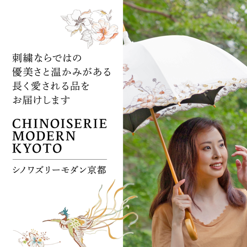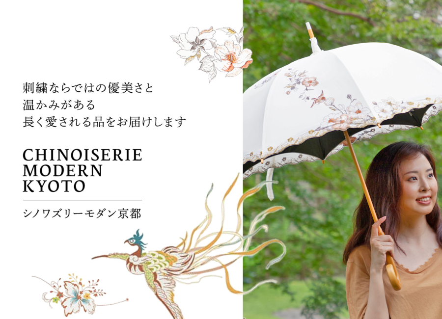 京都画壇の日本画家だった祖父のスケッチを基にした刺繍デザインの数々。 代表的な『女優日傘』は、そのデザインを生かした全面刺繍と…
