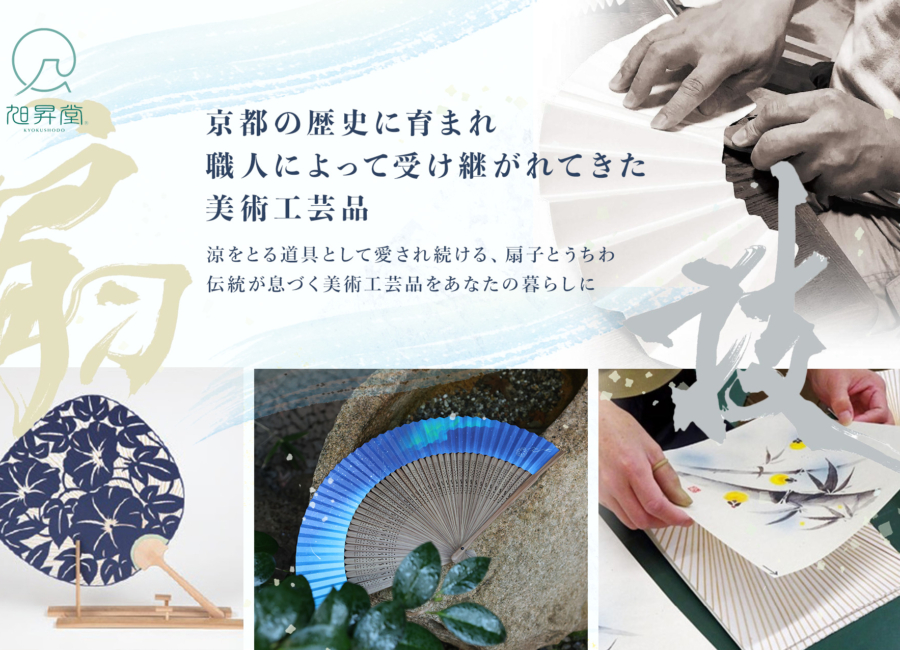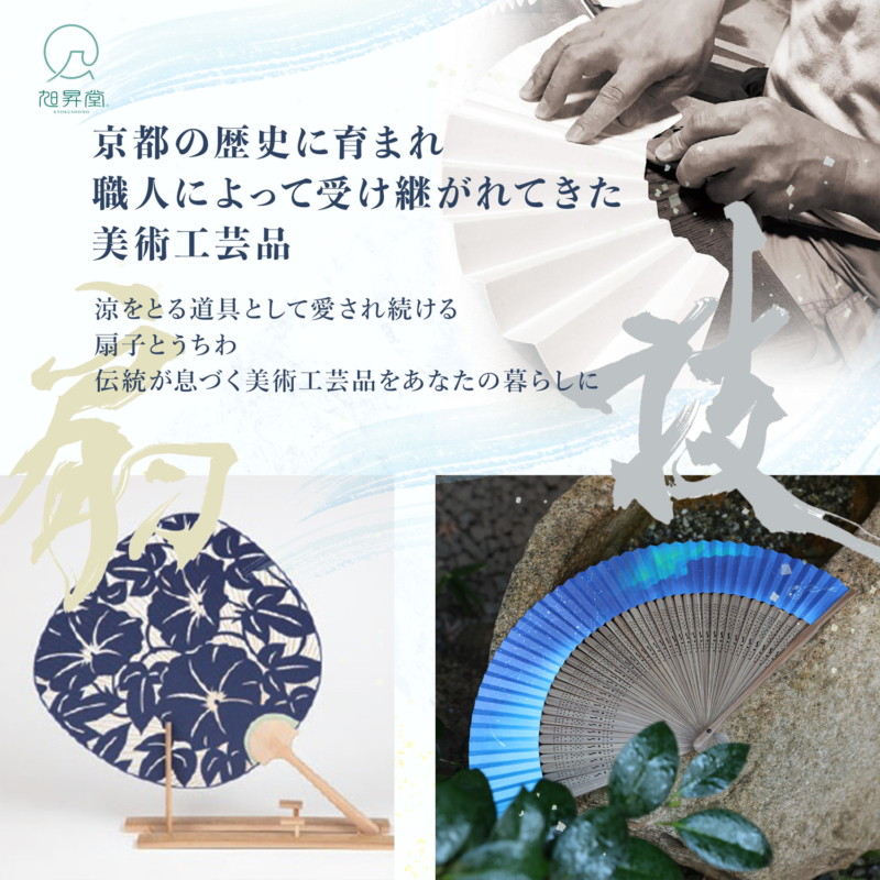 創業50年、古都京都の豊かな風土と文化に育まれ、うちわや扇子作りに携わってきた先人たちの知恵、技術、試行錯誤、熱い想いを受け継ぎ、「生活に彩…